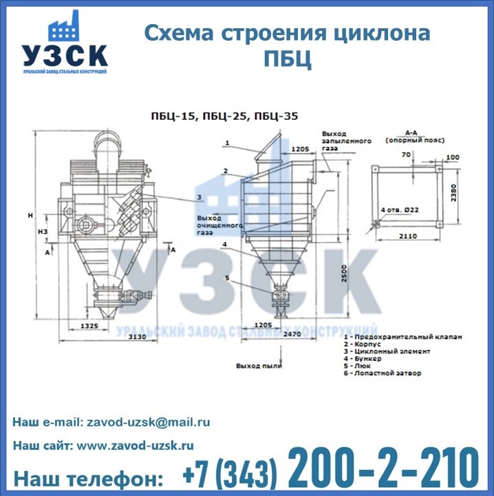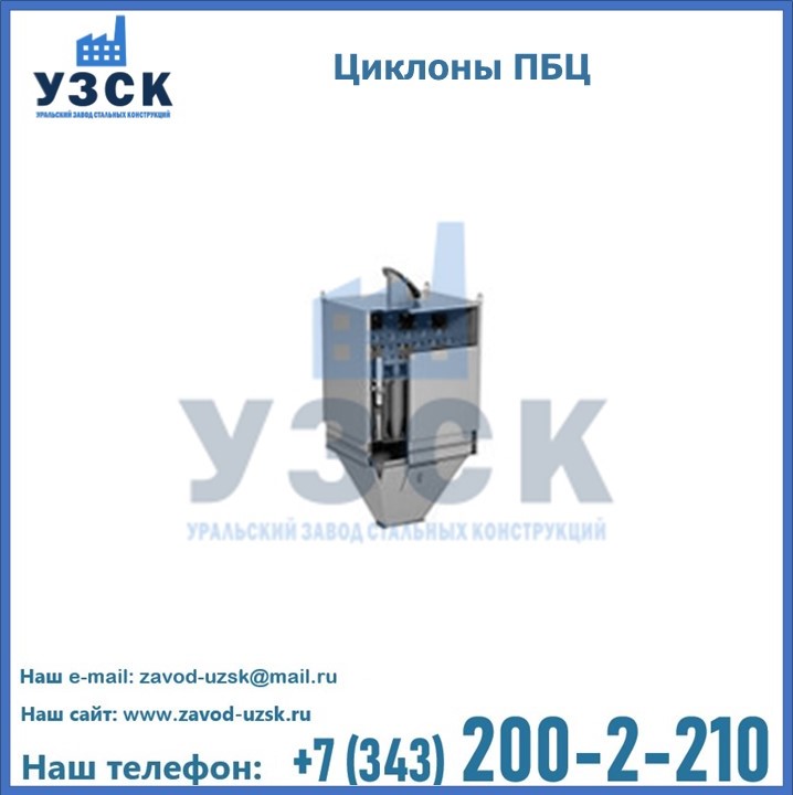 Завод «УЗСК» в Муроме предлагает приобрести циклоны ПБЦ и прочие устройства, полностью укомплектованные и готовые к эксплуатации. Мы гарантируем соответствие оборудования всем требованиям ГОСТ и ТУ, износостойкость и высокую производительность предлагаемого оборудования. Уральский Завод Стальных Конструкций изготавливает и продает надежное, эффективное и производительное оборудование, имеющее длительную гарантию и большой эксплуатационный ресурс. Если требуется изготовить циклон нестандартных размеров, то такой вариант выполнения заказа тоже предусмотрен, так как предприятие имеет собственные производственные площади и надежных поставщиков. На все поставляемое или производимое оборудование имеются чертежи и прочая техническая документация. Заказать и купить циклоны или прочее оборудование высокого качества и по доступной цене можно через наш сайт или по указанному в разделе «Контакты» телефону.
